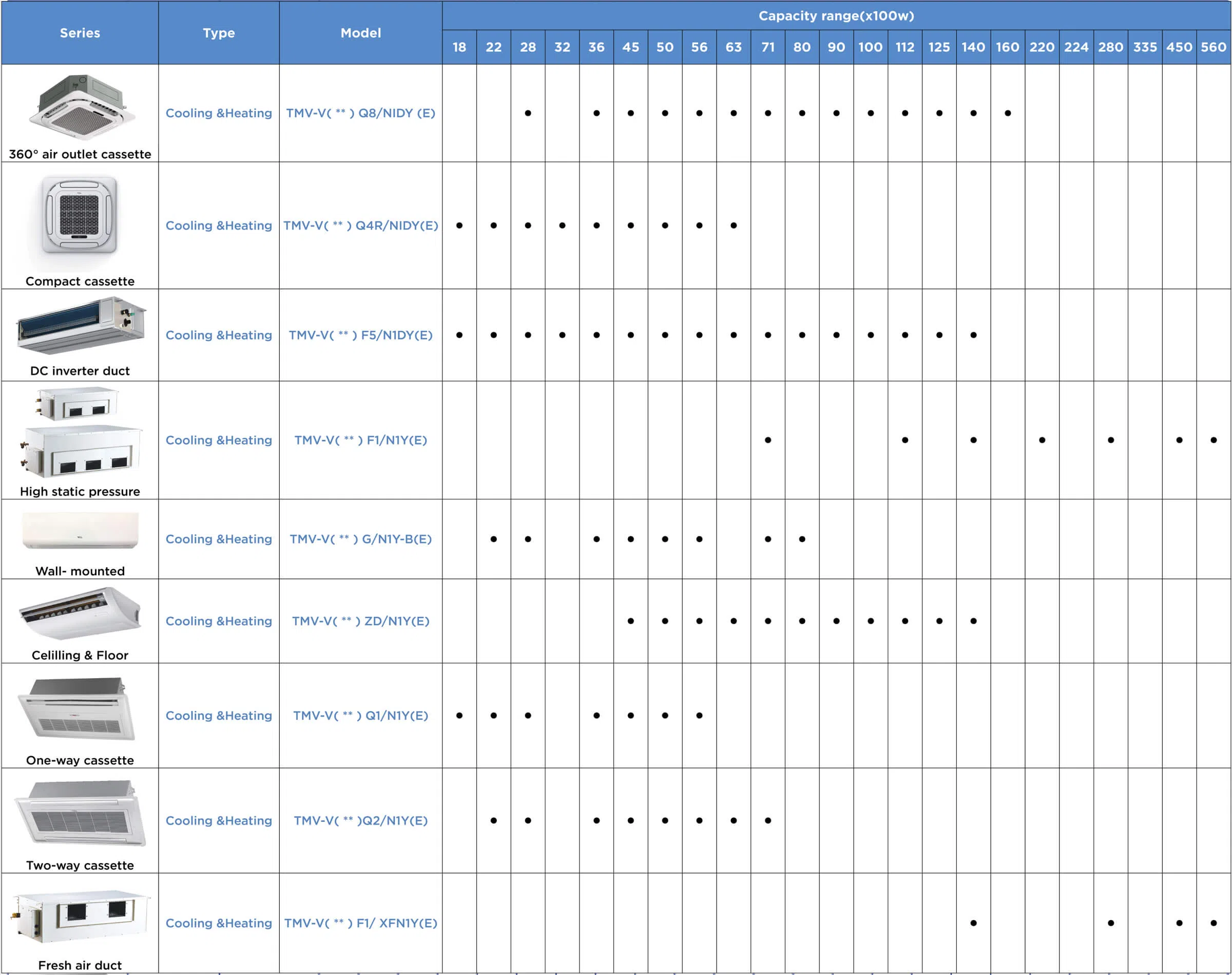 360° Air-outlet Cassette/Compact cassette New panel designLarge Air Outlet Volume7-level Fan Speed Volume360° wide-angle air supplyClean sterilization, healthy lifeDC inverter fan motor technologyUltra low noiseStandard float switch, timely warning