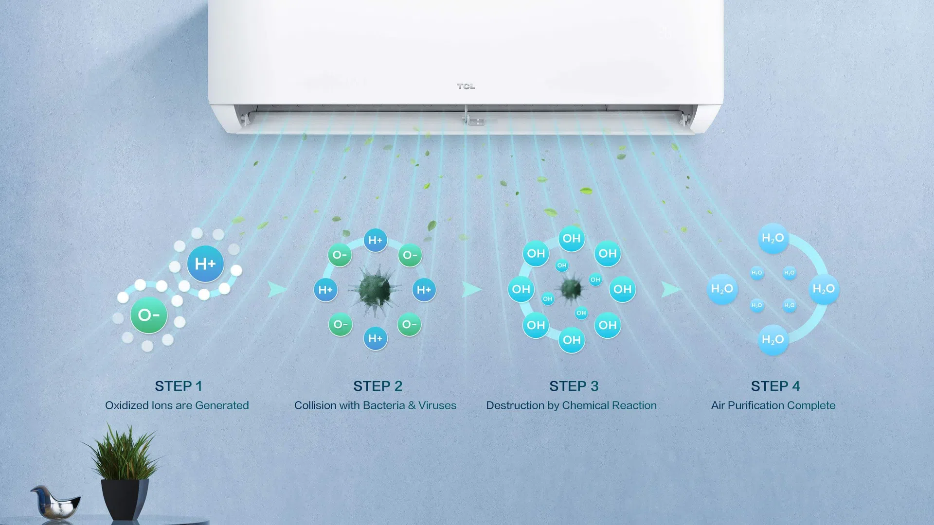 Oxidized ions are diffused into the air, colliding with bacteria and viruses. Enjoy peace of mind performance, clinically proven to inactivate protein structures, and counter airborne toxins.